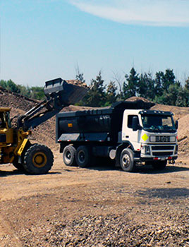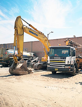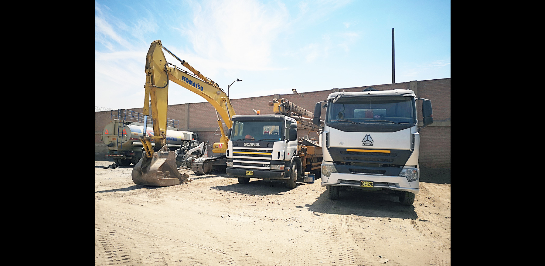 Flota de vehículos pesados para trabajos de construcción: volquetes, mixers, excavadoras, motoniveladoras, etc.